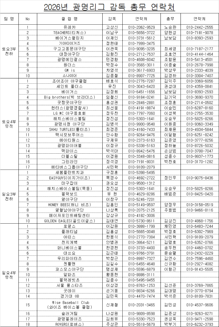 26년 리그 각 부 감독 및 총무 비상연락망 공지