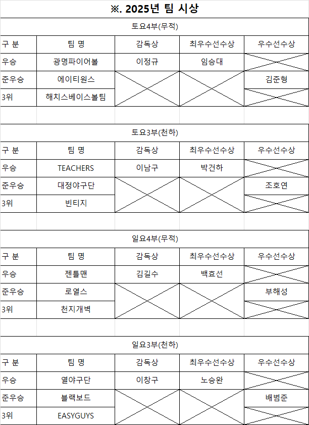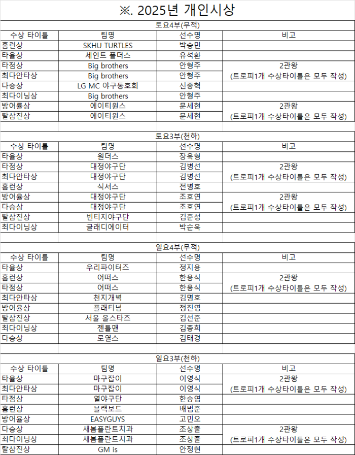 25년 시즌 팀수상 및 개인수상자 공지